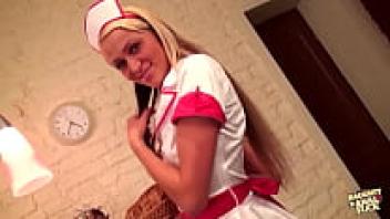 During her stay in the hospital, a horny blonde lesbian patient masturbates and bangs the highly attractive blonde nurse.