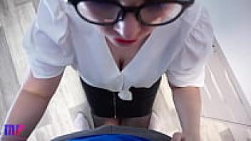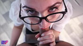 Blowjob and handjob from hottie in glasses, lots of sperm.