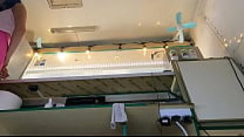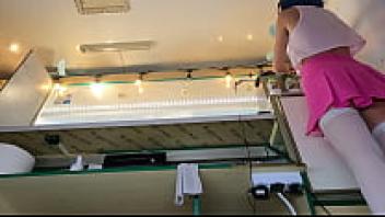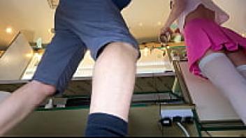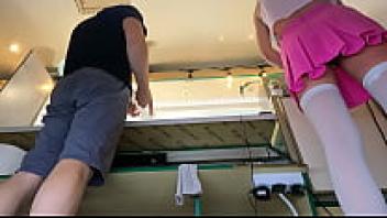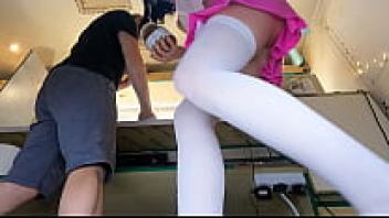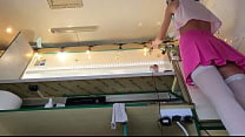 For extra money, an 18-year-old girl works in a pink miniskirt, pearl thongs, white stockings, and a braless top.MP4