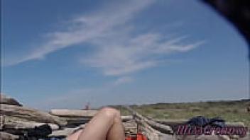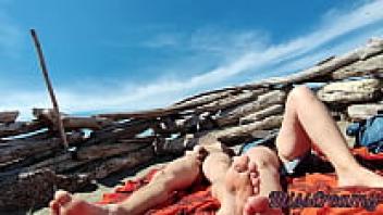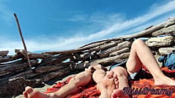 Exhibitionist Wife Outdoor Amateur Milf Handjob Big Cock in front of a voyeur with a cumshot on Nudity Beach MissCreamy
