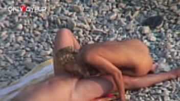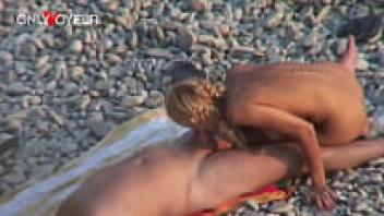 Voyeur Beach. On a public beach, a stunning blonde beauty is riding her partner.