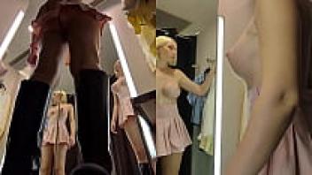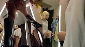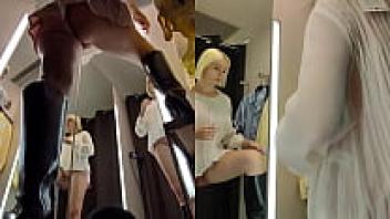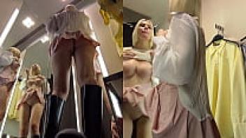 A hidden camera in the changing room shows the large tits and a juicy pussy from the bottom up.