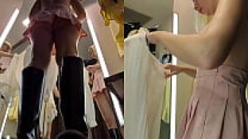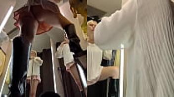 Upskirt view from the changing room. Hidden camera in the fitting room.