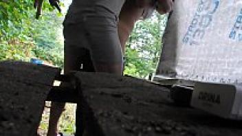 A pregnant MILF wife pumping her own enormous breasts while breastfeeding in a public outdoor setting