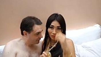 Ladyboy shares a cum swap with him while he cums in his mouth.