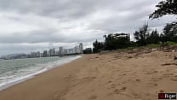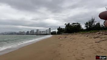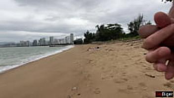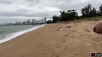 Beach sex in public, nude. After taking off her bikini, the curvy Latina fingers her sandy pussy. Beautiful Face & Perfectly Oiled Ass
