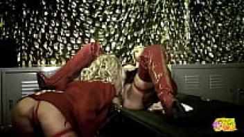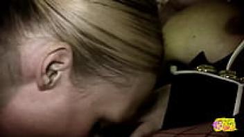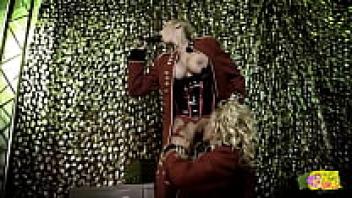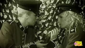 Three attractive women with large breasts wearing vintage uniforms are enjoying themselves with a stud.