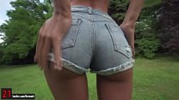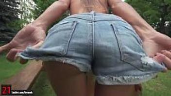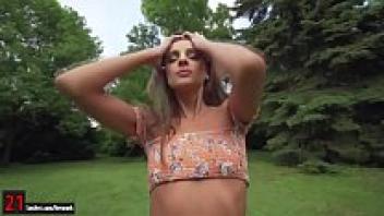Outside, slender Maria Rya presses her pussy on a massive dildo.