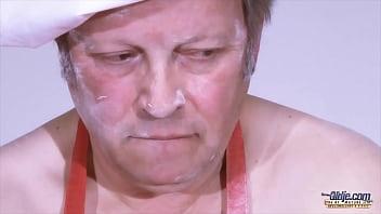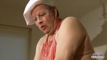 A fat old man adores a hot pussy. A young lady hardens and backdoors his cock by sucking it.