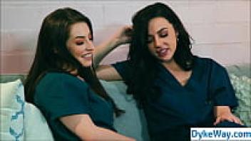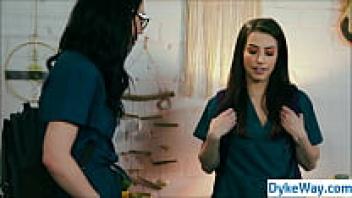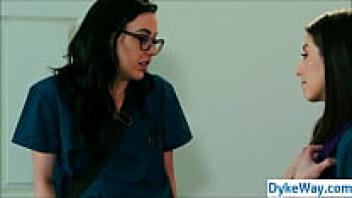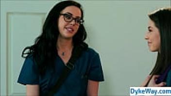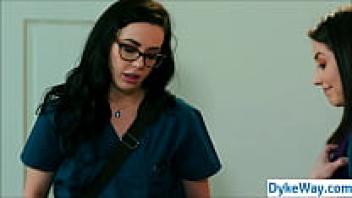 When they are in school, a skinny teen student seduces a blonde nurse with huge breasts.