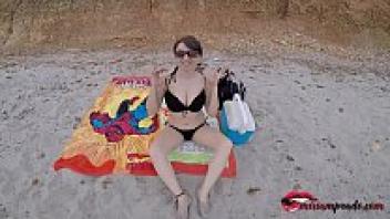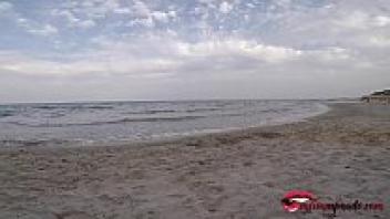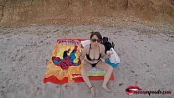 Miriam Prado: A young girl with large tits performs a handjob on a public beach.