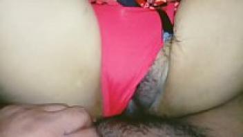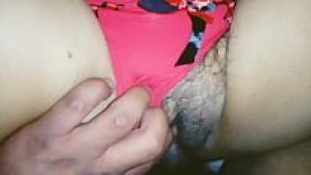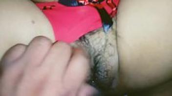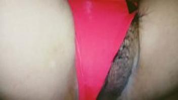 She spreads her legs and hands her hairy pussy with the red thong.