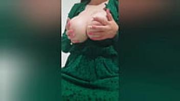 Her nipples are excited by a hottie wearing a green dress and having large tits. - LuxuryOrgasm