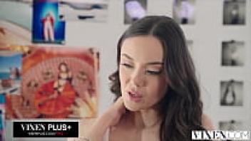 Catherine Knight, a gorgeous brunette model, can't help but stare at the photographer's enormous cock.