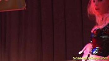 Stepmom naked on stage, covered in grease and busty