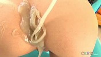 covering the slender body and shaved pussy of a Japanese adolescent with slime!