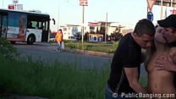 Amazing public gangbang threesome group having sex on the street with a gorgeous blonde