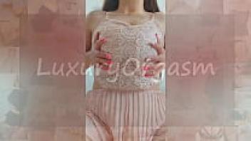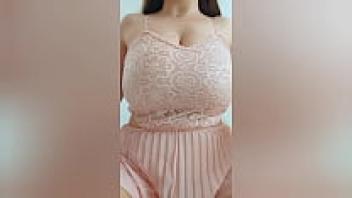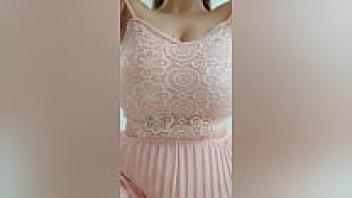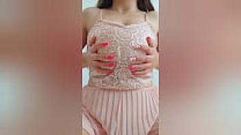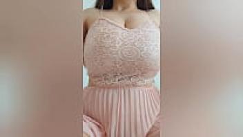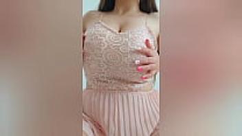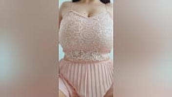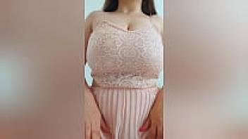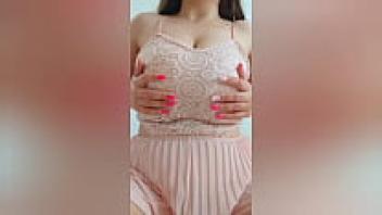 A lovely girl with brown hair and a pink outfit plays with her large tits. Unprofessional video