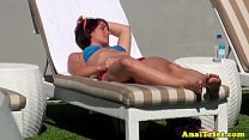 A slim French brunette in stockings is shown on an amateur anal casting couch.
