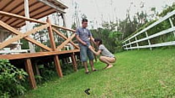 Blowjob outside, followed by hairy pussy love