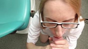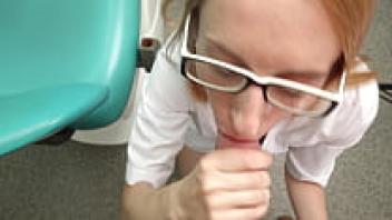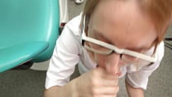 Dentist with glasses gets on his knees and sucking cock. Facial cumshot.