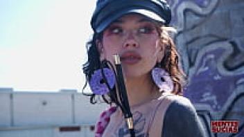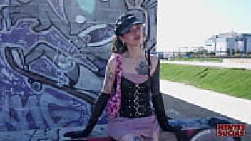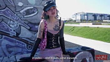 A young woman is seen dancing naked on a car while wearing a BDSM fetish mask. The scene takes place at a car wash.