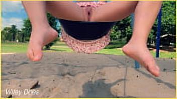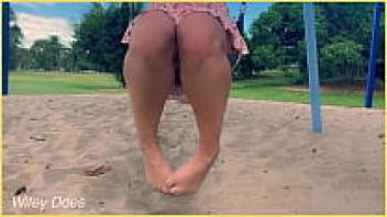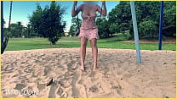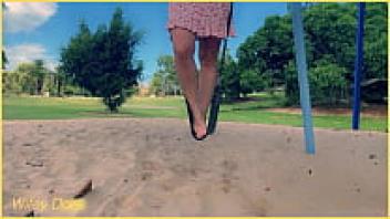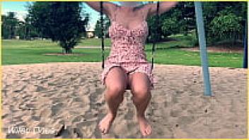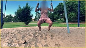 Without underwear, the wife swings in the park. public display artist